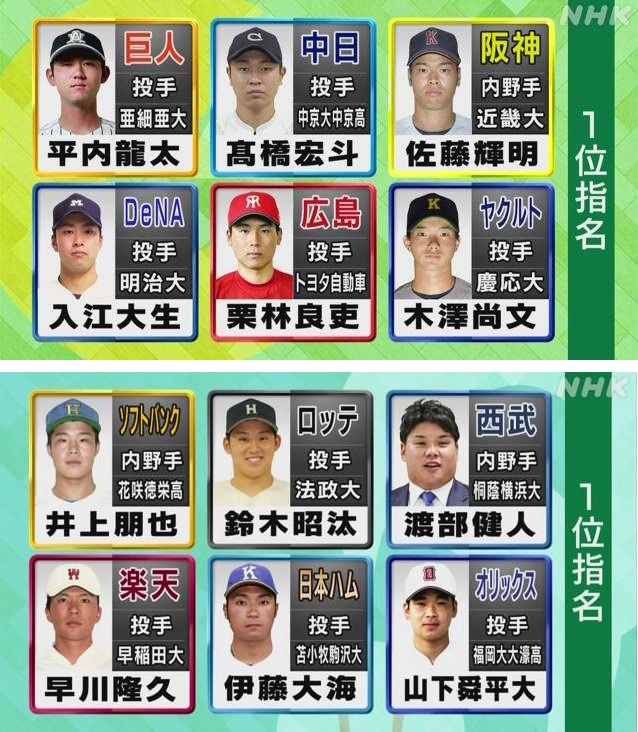 さらにオリックスが福岡大大濠高校の山下舜平大投手、西武が桐蔭横浜大の渡部健人選手、ソフトバンクが埼玉の花咲徳栄高校の井上朋也選手、巨人が亜細亜大の平内龍太投手の交渉権をそれぞれ獲得しました。