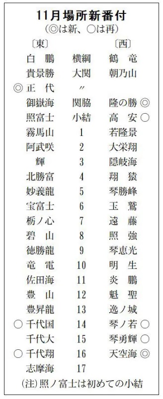 秋場所優勝の正代が新大関 11月場所新番付 ―― 日本相撲協会は26日、福岡から東京へ会場を移して開催される大相撲11月場所(8日初日、両国国技館)の新番付を発表し、秋場所で初優勝した新大関の正代は東の2番目に就いた。先場所、西前頭筆頭で10勝を挙げた隆の勝は新関脇。千賀ノ浦部屋からは初めての新三役となった。