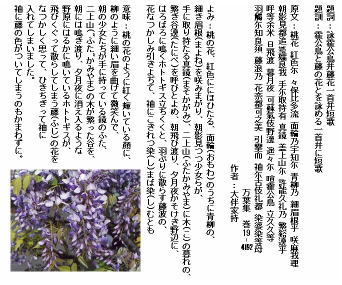 巻19-4192: 桃の花紅色ににほひたる面輪のうちに.......(長歌)