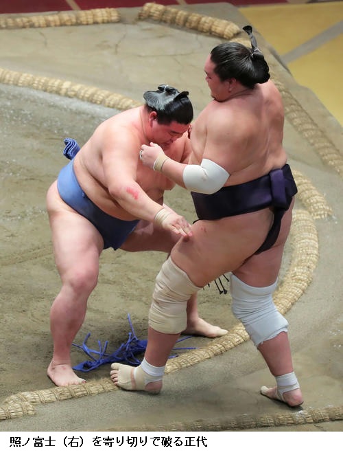 関脇 正代は照ノ富士を破り、「うれしかった。前に出る相撲を意識した。中途半端に当たって持っていかれるよりは、思い切り前に出ることに集中していた。好調な相手なので、前日の夜から意識していた。あと一番、楽しめればいいなと思う。優勝を意識しないで、頭の片隅に置いておくくらいの気持ちでいきたい」と、落ち着いた様子で話していました。