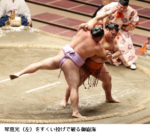 ▽御嶽海に琴恵光は、御嶽海がすくい投げで3敗を守りました。