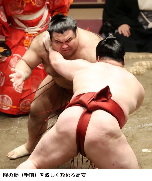 ▽隆の勝に高安は、高安が引き落としで勝って10勝を挙げました。