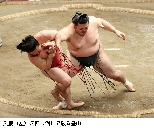 ▽炎鵬に豊山は、豊山が押し倒し。