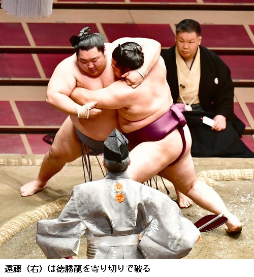 ▽遠藤に徳勝龍は、遠藤が寄り切りで勝って勝ち越し。