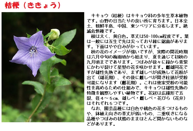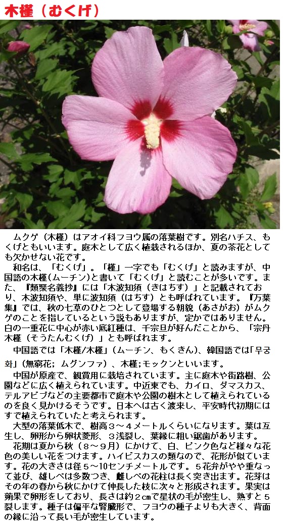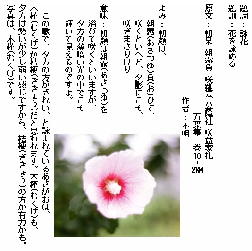 万葉集に登場する「朝顔(あさがほ)」は、私たちが良く知っているあのヒルガオ科のあさがおとは違います。当時は、朝に咲くきれいな花を「朝顔(あさがほ)」と呼んだようです。桔梗(ききょう)、木槿(むくげ)などとする説があり、はっきりとはしていません。写真は、桔梗(ききょう)と木槿(むくげ)です。