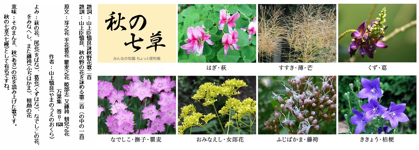 巻8-1538: 萩の花尾花葛花なでしこの花をみなへしまた藤袴朝顔の花