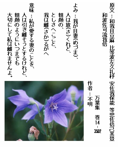 巻14-3502: 我が目妻人は放くれど朝顔のとしさへこごと我は離るがへ