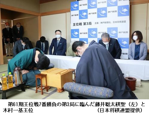 持ち時間各8時間のうち、残り時間は藤井2分、木村1分。第4局は福岡市の「大濠公園能楽堂」で19、20日に指される。