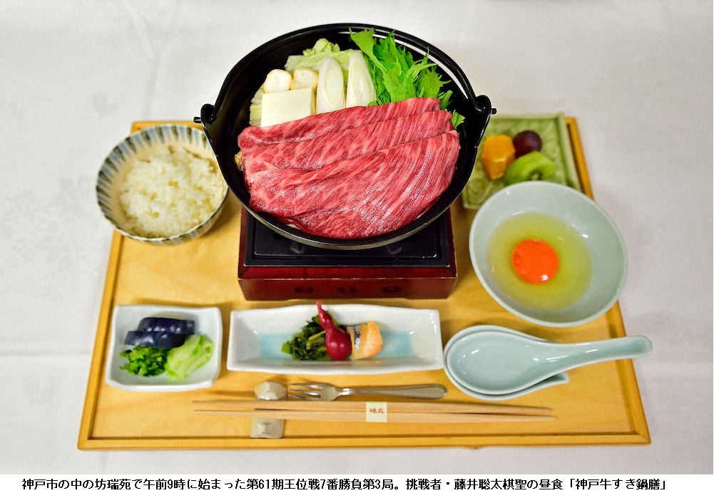 藤井棋聖昼食は神戸牛すき鍋膳、木村王位はうな重膳 ―― 藤井聡太棋聖(18)が木村一基王位(47)に挑む第61期王位戦7番勝負の第3局が4日午前9時、有馬温泉(神戸市北区)の老舗旅館「中の坊瑞苑(ずいえん)」で始まり、午後0時30分、昼食休憩に入った。