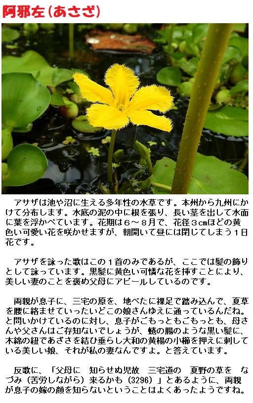 阿邪左(あざさ)は、ミツガシワ科アサザ属の多年草の浅沙(あさざ)とされています。池や沼などに自生する水草です。夏に、葉の間から伸びた茎の先に小さな黄色い花を咲かせます。花蓴菜(じゅんさい)とも呼ばれます。