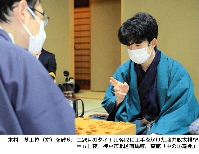 藤井聡太棋聖、史上最年少二冠に王手 王位戦第3局149手で勝利 ―― 将棋の木村一基王位(47)に藤井聡太棋聖(18)が挑戦している第61期王位戦7番勝負(神戸新聞社主催)の第3局は5日、神戸市北区有馬町、有馬温泉の旅館「中の坊瑞苑」で指し継がれ、午後7時22分、先手番の藤井が149手までで勝利。シリーズ通算3勝0敗で、王位奪取まであと1勝とし、羽生善治(49)の21歳11カ月を大きく上回る史上最年少の二冠に王手をかけた。