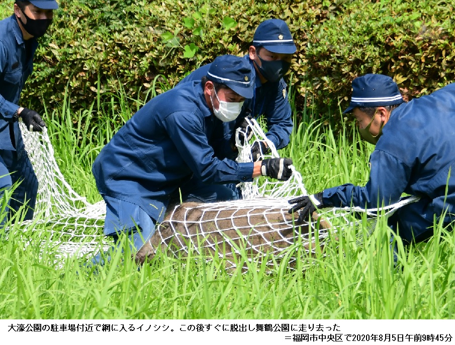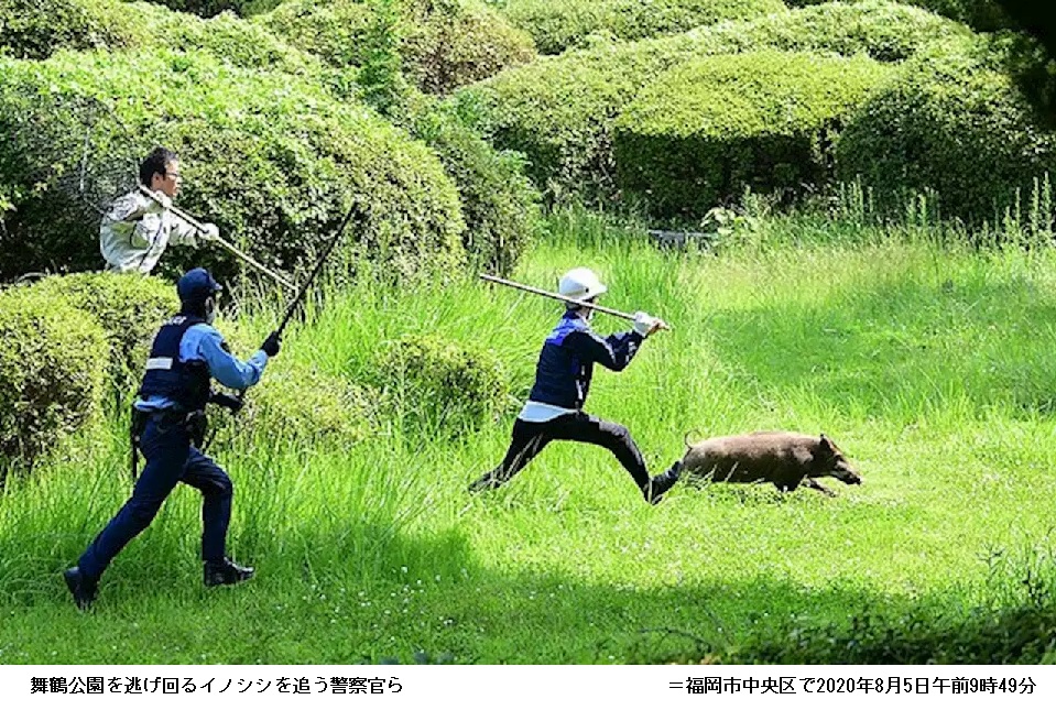 福岡・大濠公園にイノシシ 警官ら大捕物、逃走後「御用」に ―― 5日午前6時5分ごろ、福岡市中央区の大濠公園付近で、公園沿いにある在福岡米国領事館を警備中の福岡県警機動隊員が1頭のイノシシを見つけた。逃走するイノシシを警察官らが追いかけ、公園内の市美術館付近の草むらに潜んだところを捕獲しようとしたが失敗。イノシシは隣接する舞鶴公園(福岡城跡)に逃げ込み、市中心部で逃走を続けたが正午前に捕獲された。