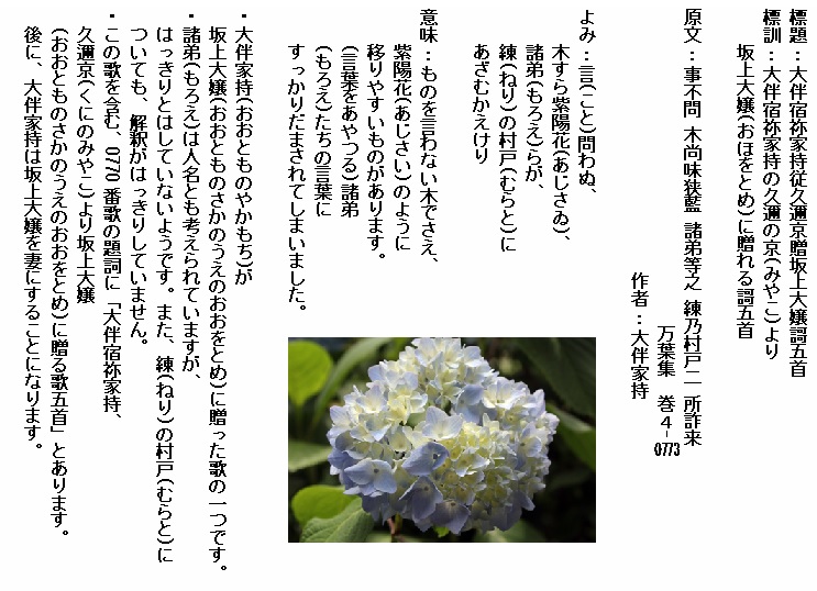 巻4-0773: 言問はぬ木すら紫陽花諸弟らが練りのむらとにあざむかえけり