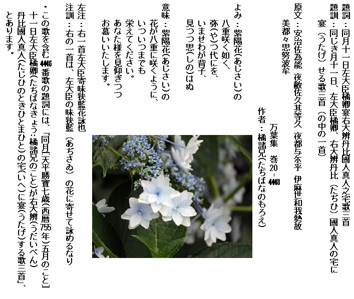 巻20-4448: 紫陽花の八重咲くごとく八つ代にをいませ我が背子見つつ偲はむ