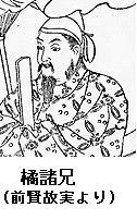 奈良時代の政治家。皇族の出身で敏達天皇5世の子孫で、父は従四位下美努 (みぬ) 王です。母は県犬養橘三千代 (あがたのいぬかいのたちばなのみちよ)です。室は藤原不比等の娘多比能です。本名は葛城王といいます。和銅3 (710) 年従五位下、以後累進して、天平3(731)年参議、同8年弟の作為王とともに、朝廷に請うて、母の氏姓橘宿禰姓を賜わり、名を諸兄と改めました。同9年大悪疫のため,藤原4卿(武智麻呂、房前、宇合、麻呂) の死没後、大納言、右大臣と躍進し、唐から帰国した玄昉、吉備真備らと結んで政界の新興勢力を形成、全盛期を迎えました。しかし、天平末年以降藤原広嗣の乱、恭仁京経営の失敗、権臣藤原仲麻呂の台頭によって、権勢は影をひそめていきました。玄昉,真備らも左遷され、天平勝宝8(756)年官を辞し、失意のうちに没しました。