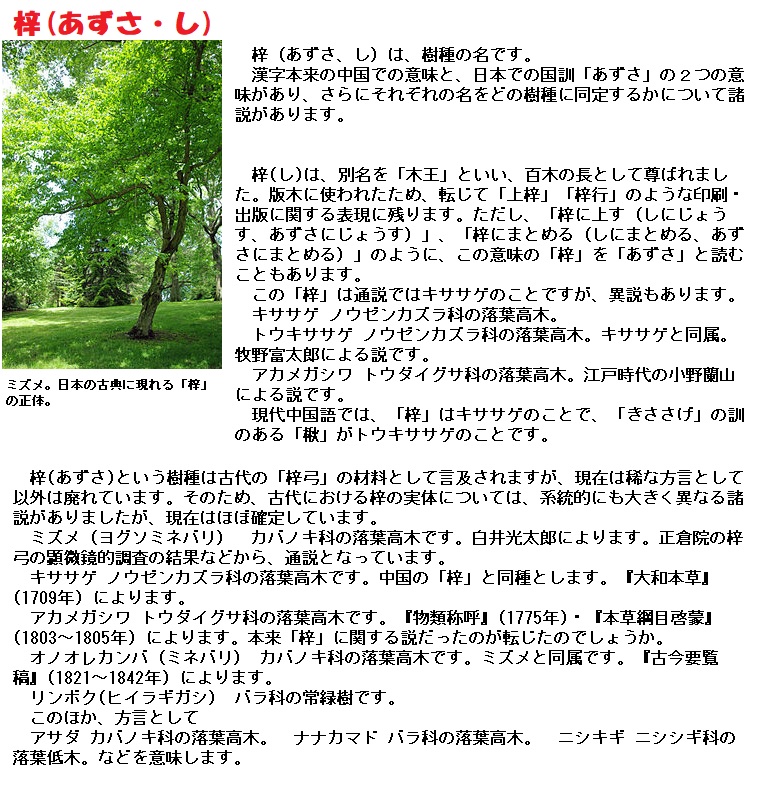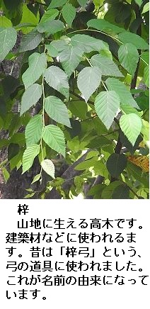 梓(あづさ)はカバノキ科の植物で、材質が強靭なので弓の材料として使われていたそうです。丸木弓が正倉院に残っているそうです。