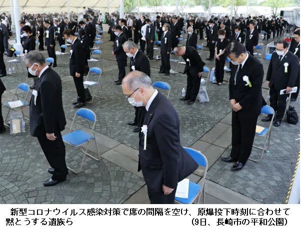 長崎市によると、式典には被爆者や遺族、68カ国の代表ら約500人が出席。新型コロナ対策として例年の10分の1程度に縮小した。参列者は原爆投下時刻の午前11時2分に黙とうし、犠牲者の冥福を祈った。この1年間で新たに3406人の原爆死没者の名簿が奉安され、長崎原爆の死没者は計18万5982人になった。