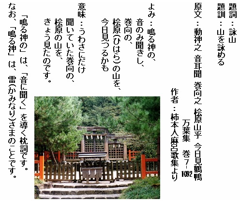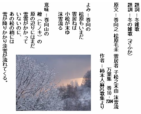 巻10-2314: 巻向の桧原もいまだ雲居ねば小松が末ゆ沫雪流る