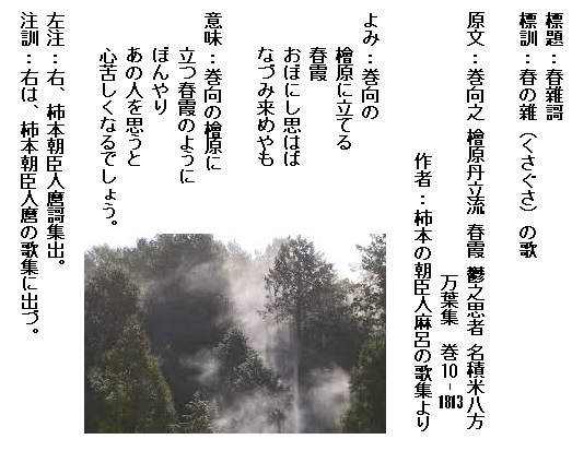 巻10-1813: 巻向の桧原に立てる春霞おほにし思はばなづみ来めやも