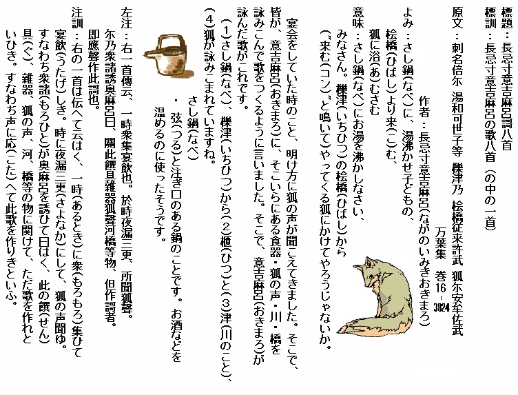 巻16-3824: さし鍋に湯沸かせ子ども櫟津の桧橋より来む狐に浴むさむ