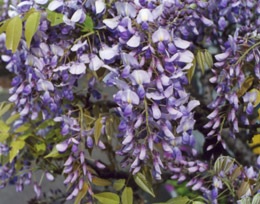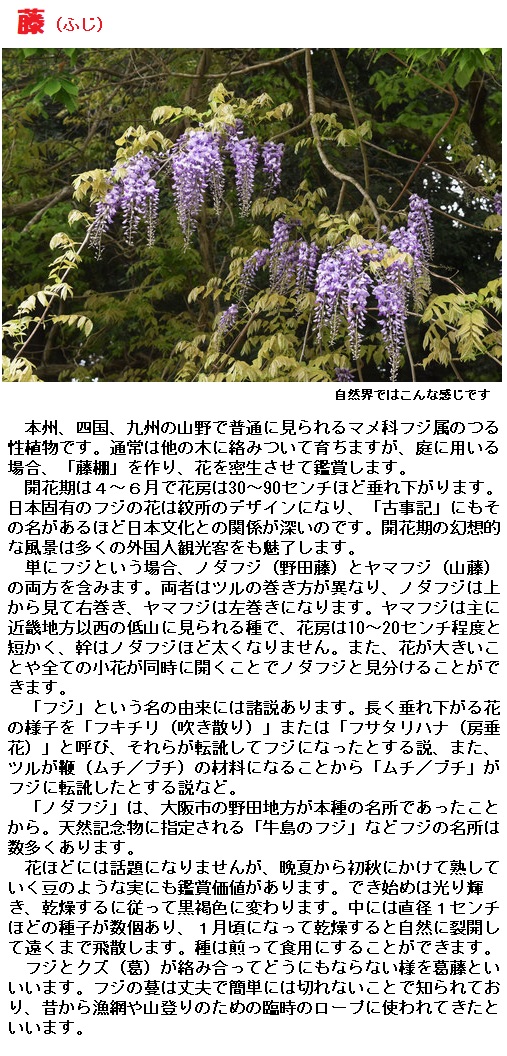 豆科フジ属のツル性の落葉樹で日本に古くからあります。4月~5月に小さな花が沢山垂れ下がります。