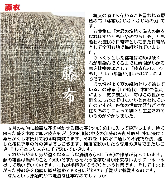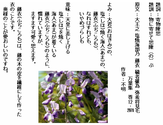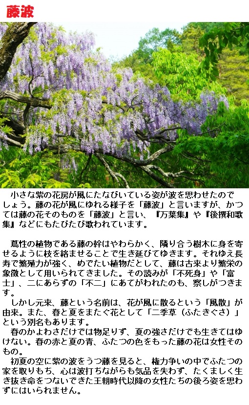 万葉集では藤は、藤波と表現されることが多いです。また、海女(あま)の藤衣(ふじころも)と表現されているものは、つるの繊維で織った粗末な衣のことのようです。