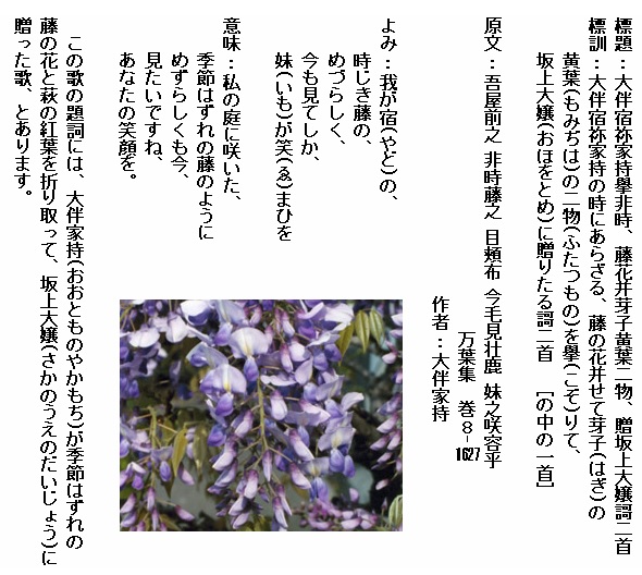 巻8-1627: 我が宿の時じき藤のめづらしく今も見てしか妹が笑まひを