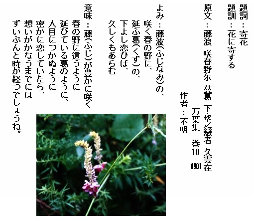 巻10-1901: 藤波の咲く春の野に延ふ葛の下よし恋ひば久しくもあらむ