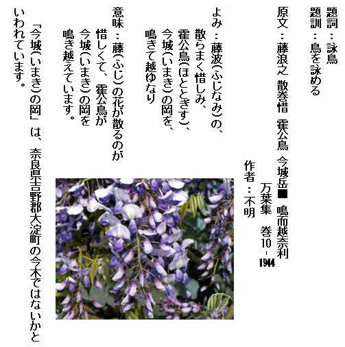 巻10-1944: 藤波の散らまく惜しみ霍公鳥今城の岡を鳴きて越ゆなり