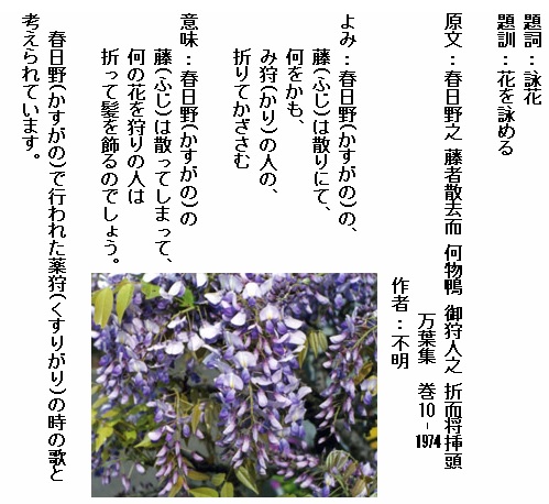 巻10-1974: 春日野の藤は散りにて何をかもみ狩の人の折りてかざさむ
