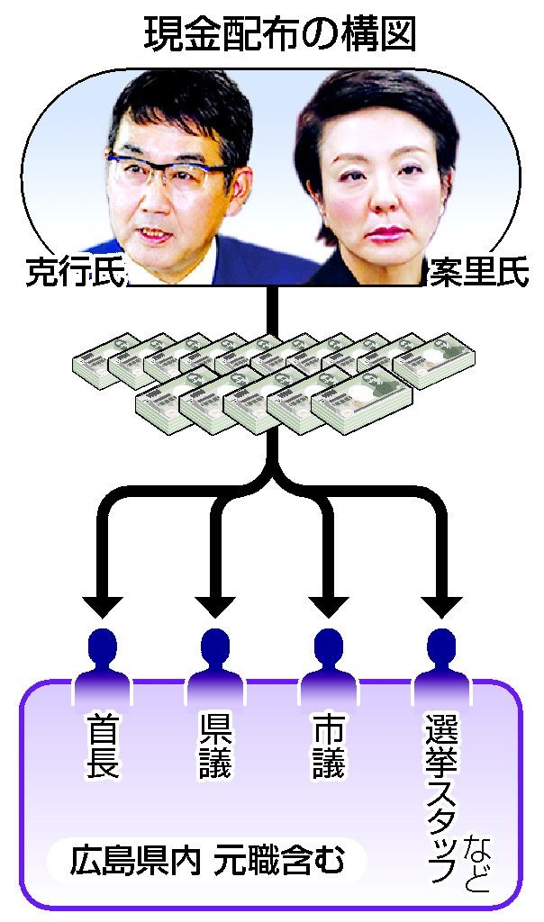 関係者によると、配られた現金は2000万円を超え、多くは前法相が配布。一部は案里議員自身が配っていた。