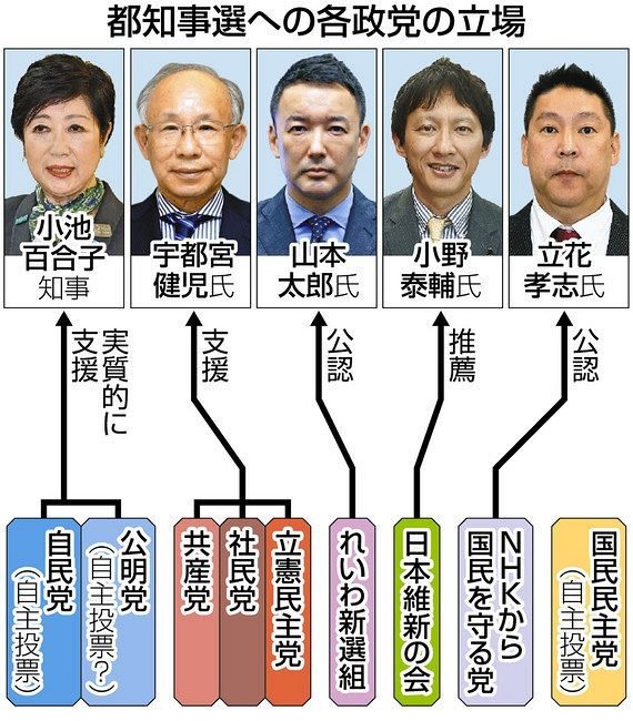 東京都知事選の告示を三日後に控えた十五日、選挙戦の主な構図が固まった。だが主要政党はいずれも自前で候補を立てられず、首都決戦としては異例の党派色が薄い展開となった。思惑や背景を追った。 (東京新聞 2020年6月16日 06時58分)