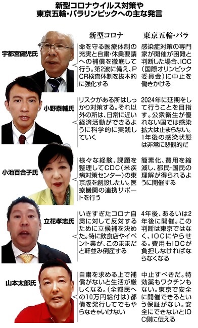 来年の五輪・パラの「中止」を明言したのは山本氏。「特効薬もワクチンもない。開催地として安全にできないということをIOC側に伝えるべきだ」と訴えた。宇都宮氏も「感染症の専門家が開催困難と判断した場合は、IOCに中止を働きかける。中止で浮いた予算はコロナ災害の被害に遭った都民の支援に回したい」と述べた。