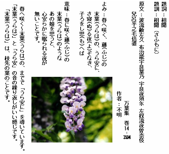 巻14-3504: 春へ咲く藤の末葉のうら安にさ寝る夜ぞなき子ろをし思へば