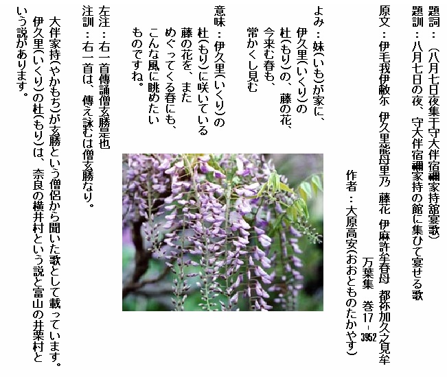 巻17-3952: 妹が家に伊久里の杜の藤の花今来む春も常かくし見む