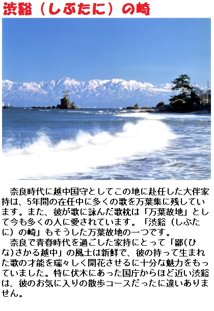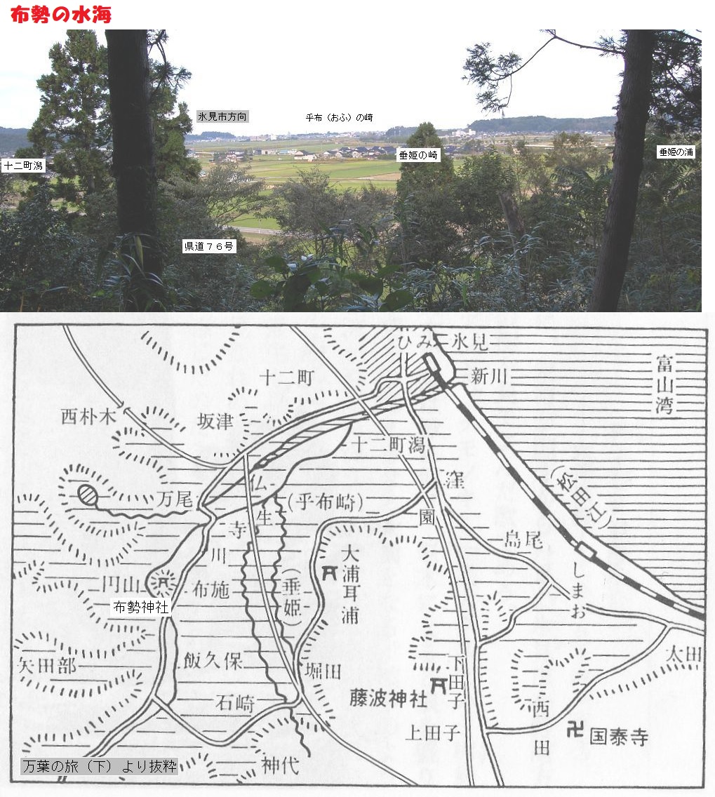 よみ:念(おも)ふどち 大夫(ますらを)の 木(こ)の暗(くれ) 繁き思ひを 見(み)明(あき)らめ 情(こころ)遣らむと 布勢の海に 小船つら並(な)め 真櫂(まかい)掛け い漕ぎ廻れば 乎布(をふ)の浦に 霞たなびき 垂姫に 藤波咲て 浜清く 白波騒き しくしくに 恋はまされど 今日のみに 飽き足らめやも かくしこそ いや年のはに 春花し 茂き盛りに 秋し葉の 黄色(もみち)し時に あり通ひ 見つつ偲はめ この布勢の海を
