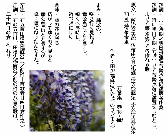 巻18-4042: 藤波の咲き行く見れば霍公鳥鳴くべき時に近づきにけり