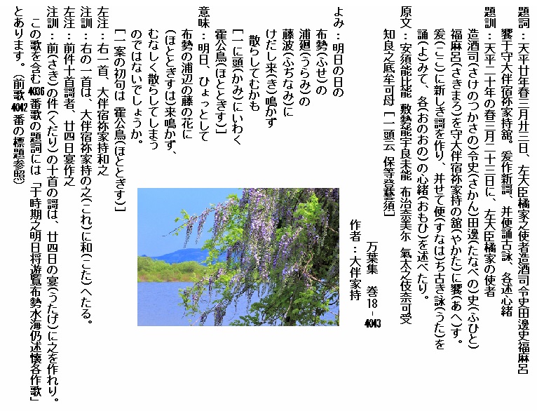 巻18-4043: 明日の日の布勢の浦廻の藤波にけだし来鳴かず散らしてむかも
