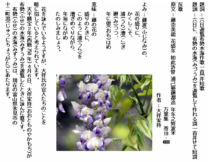 意味:藤の花房は咲いてもう散ってしまった、卯の花は今がまっ盛りだとばかりに、あなたの山にも野にも時鳥がしきりに鳴き立てているので、思い靡く心もしおれればかりに時鳥の声が恋しくなって、心打ち解けた者同士馬に鞭打ち相連れ立って出かけて来て目にやると、射水川の河口の洲鳥、洲に遊ぶその鳥は、朝凪に干潟で餌をあさり、夕潮が満ちて来ると妻を求めて呼び交わしている。心引かれはするものの横目に見て通り過ぎ、渋谷の荒磯の崎に沖の波が寄せてくる玉藻を、一筋縒りに縒って縵に仕立て、いとしい人に見せるつとにもと手に巻きつけて、霊験あらたかなる布勢の水海で、海人の小舟に楫を揃えて貫き出し、白栲の袖を翻しながら声かけ合って一同漕ぎ進んで行くと、乎布の崎には花が散り乱れ、波打際には葦鴨が群れ騒ぎ、さざ波立つというではないが、立って見ても坐って見ても、あちこち漕ぎ廻って見ても、見飽きることがない。ああ、秋になったら黄葉の映える時に、また春がめぐってきたら花の盛りの時に、どんな時にでもあなたのお伴をして、今見るように思う存分眺めて楽しみたいものです。われらがこの地を顧みることが絶える日など、どうしてありましょう。