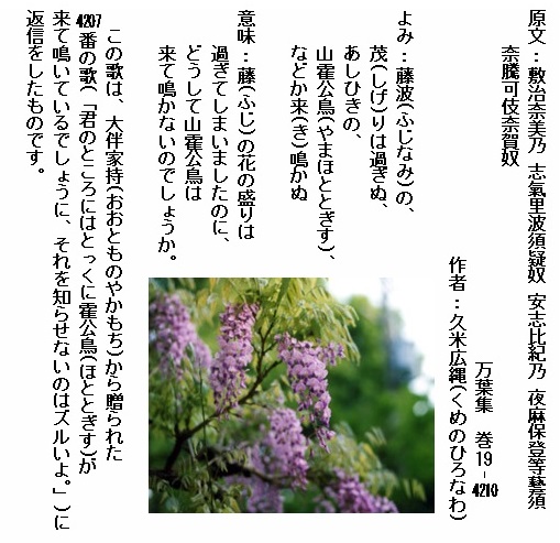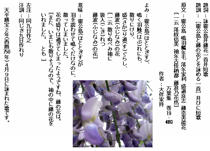 巻19-4193: 霍公鳥鳴く羽触れにも散りにけり盛り過ぐらし藤波の花
