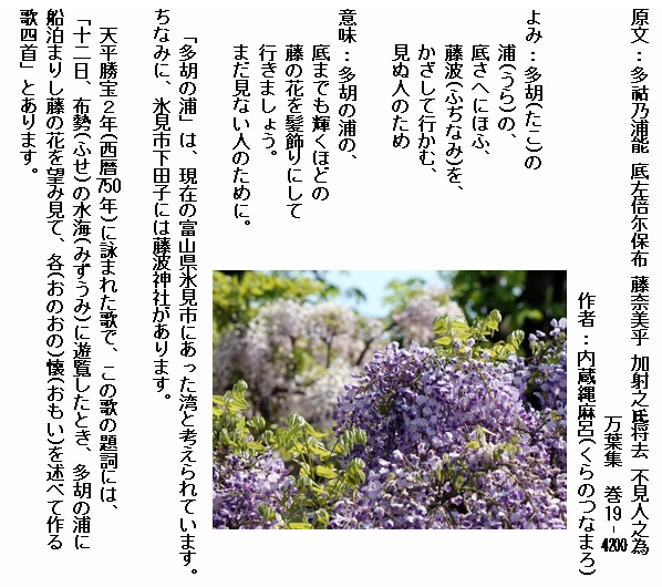 巻19-4200: 多胡の浦の底さへにほふ藤波をかざして行かむ見ぬ人のため