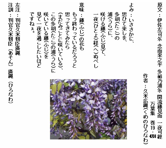 巻19-4201: いささかに思ひて来しを多胡の浦に咲ける藤見て一夜経ぬべし