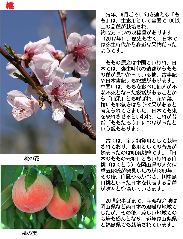 桃は、バラ科の落葉高木です。4月頃に葉よりも先にいわゆる桃色の花が咲きます。原産は中国ですが、かなり古い時代に日本に渡ってきたようです。昔は、桃は鬼や悪霊をやっつける木だと考えられていました。三月三日の節句には桃の花を神様に供えたそうです。