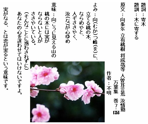 巻7-1356: 向つ峰に立てる桃の木ならめやと人ぞささやく汝が心ゆめ