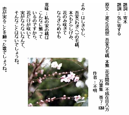 巻7-1358: はしきやし我家の毛桃本茂く花のみ咲きてならずあらめやも
