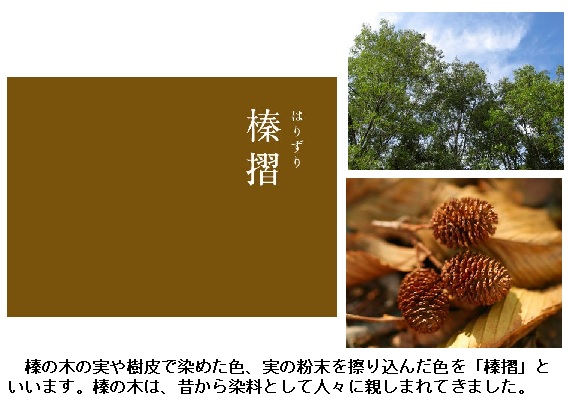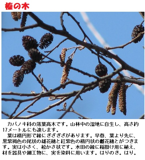 榛(はり)は、萩(はぎ)だという説もありますが、カバノキ科ハンノキ属の落葉高木の榛の木だという説が有力視されています。3~4月頃に葉が出る前に花をつけます。松かさのような形をした果実は、古代から黒褐色の染料として利用されてきました。