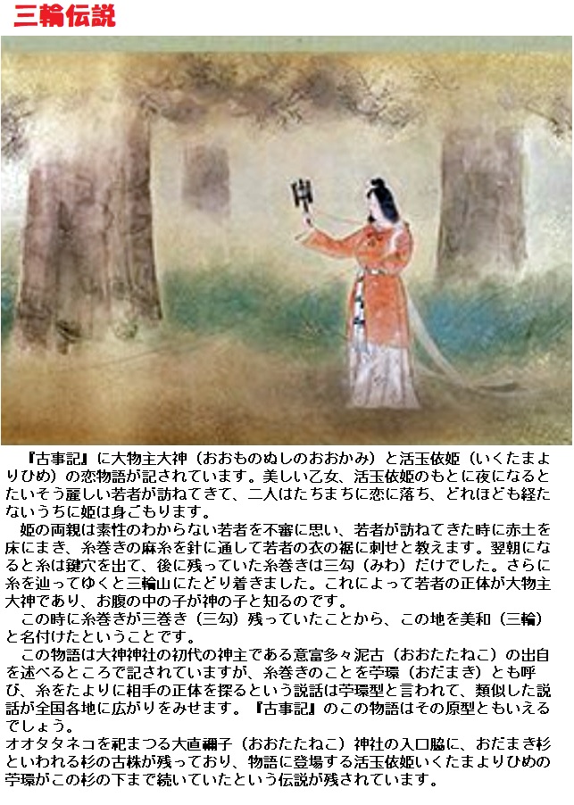 「『古事記』の崇神天皇の条にある三輪山伝説に、三輪山の神が活玉依毘売(いくたまよりひめ)のところへ通っていたが、神は身元を明らかにしない。それを針に糸を通して神の衣服に刺し、その糸の先を辿っていくと三輪山の神であったことが判明した。」