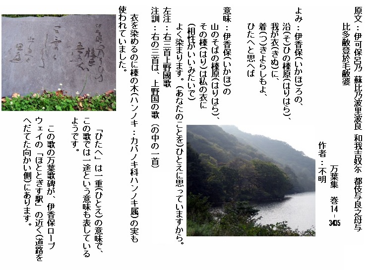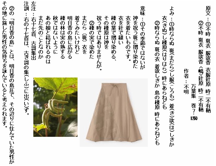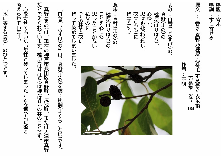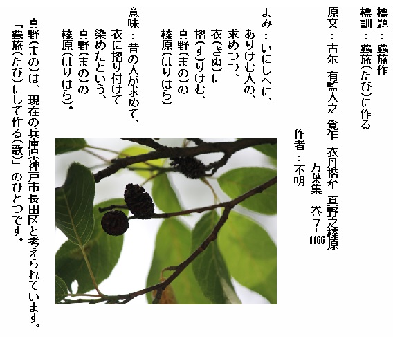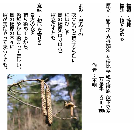 万葉集には14首に詠まれています。榛の群生地として「榛原(はりはら)」、または染料として使ったことを表して「衣に摺(す)りつ」などと詠まれている歌が多くあります。