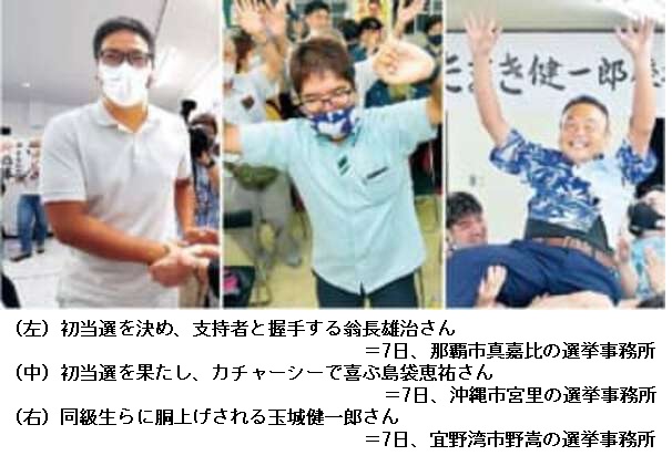 宜野湾市区の玉城健一郎さん(35)=無所属=は、日焼けした両手を高く掲げて万歳をした。「皆さんのおかげで闘え、結果を残せた。成長できた選挙だった」と当選をかみしめた。子育て中の知人も多く、これまで「若い世代の声を県政に届けたい」と訴えてきた。生まれ育った市野嵩の上空は、普天間飛行場の米軍機が轟音(ごうおん)を響かせながら飛行する。戦後75年も続く基地負担に「不条理をただすのが政治の役割だ」と訴え、県政で宜野湾の声を届ける。