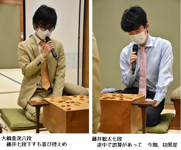 藤井と大橋は16年10月に四段に昇段した同期。両者の過去の対戦成績は2勝2敗。この日の勝利で対藤井戦、3連勝となった大橋は「藤井キラー? この先はどうなるか分かりません」と笑顔で話した。藤井が8日に第91期棋聖戦5番勝負第1局で戦った渡辺明棋聖(36)は大橋と同門の兄弟子。大橋は「兄弟子のリベンジ?」に苦笑い。